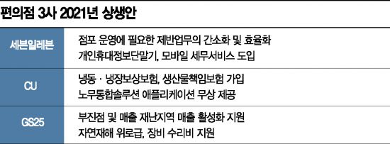 CU와 GS25는 경영주들의 복리 후생을 챙기고 나섰다. CU는 전국 점포를 대상으로 냉동·냉장보상보험과 생산물책임보험에 가입한다. 이에 대한 보험료는 전액 가맹본부가 부담한다. 냉동·냉장보상보험은 풍수해 등으로 인해 냉동·냉장집기의 전력 공급이 중단돼 상품 손실이 발생할 경우, 피해 금액을 실비로 보상 받을 수 있는 보험이다.