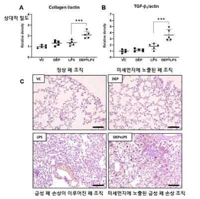 미세먼지에 노출된 호흡기 질환 쥐는 단순 호흡기 질환 쥐보다 폐 내 TGF-β1 발현이 2배 증가한 것으로 나타났다.