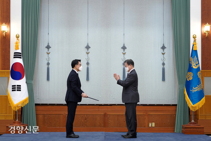 문 대통령은 김 처장에게 “엄중한 시기에 많은 사람의 관심이 집중돼 아주 부담스러운 직책을 피하지 않고 적극적으로 수용해주신 데 대해 경의를 표한다”며 축하의 말을 건넸다.