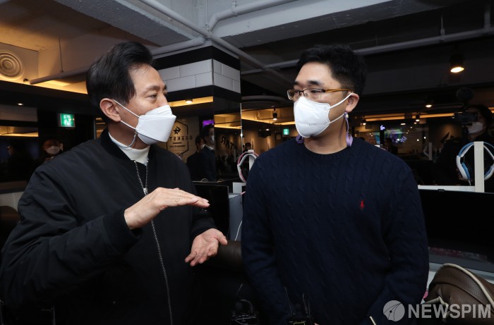 [서울=뉴스핌] 국회사진취재단 = 서울시장 보궐선거에 출마한 국민의힘 오세훈 전 서울시장이 21일 서울 서대문구 북가좌동에 위치한 한 PC방을 찾아, 코로나19로 극심한 피해를 본 자영업자들의 고충을 듣고 있다. 2021.01.21 photo@newspim.com