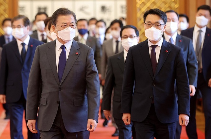 문재인 대통령이 21일 오전 청와대에서 열린 임명장 수여식을 마친 후, 김진욱 초대 고위공직자범죄수사처장과 함께 환담장으로 이동하고 있다. 뉴시스 |