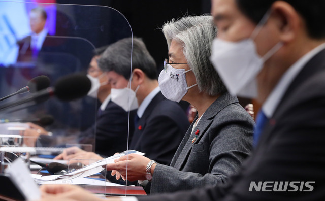 [서울=뉴시스]추상철 기자 = 강경화 외교부 장관이 21일 오후 청와대 여민1관에서 열린 국가안전보장회의(NSC) 전체회의 및 외교안보부처 업무보고에 참석해 있다. 2021.01.21. scchoo@newsis.com |