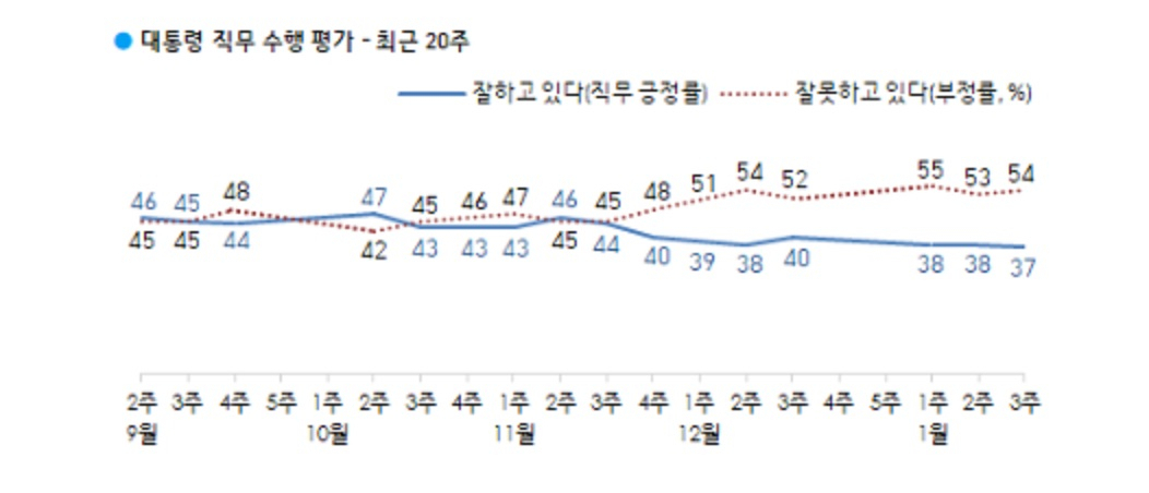 한국갤럽은 “지난해 12월부터 대통령 직무 긍정률은 30%대 후반에서 40% 사이, 부정률은 50%를 웃도는 상태가 지속 중”이라며 “수치상 직무 긍정률이 지난주보다 1%포인트 하락해 취임 후 최저치를 경신했다”고 설명했다.