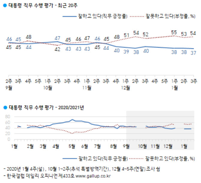 전날 리얼미터 발표와 상반된 결과다. 리얼미터는 1월 3주차 문 대통령 주중 지지율이 전주 대비 5.7%포인트 급등한 43.6%였다고 발표했다. 문 대통령이 신년 기자회견에서 각종 이슈에 솔직 답변하는 모습이 민심을 움직인 것 아니냐는 해석이 나왔다.