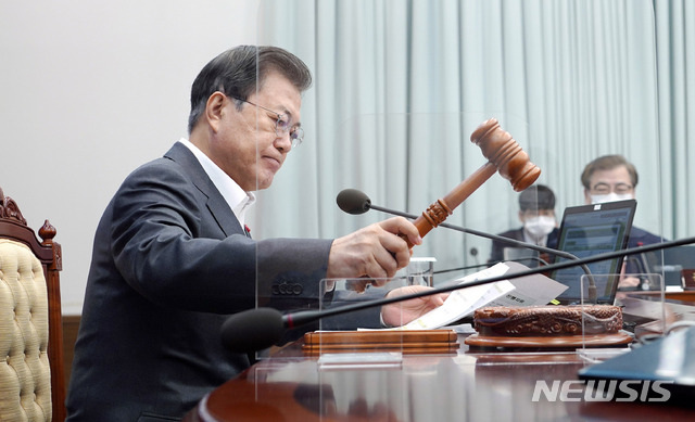 [서울=뉴시스]추상철 기자 =문재인 대통령이 19일 오전 청와대 여민관에서 영상으로 열린 제3회 국무회의에 참석해 의사봉을 두드리고 있다. 2021.01.19. scchoo@newsis.com |