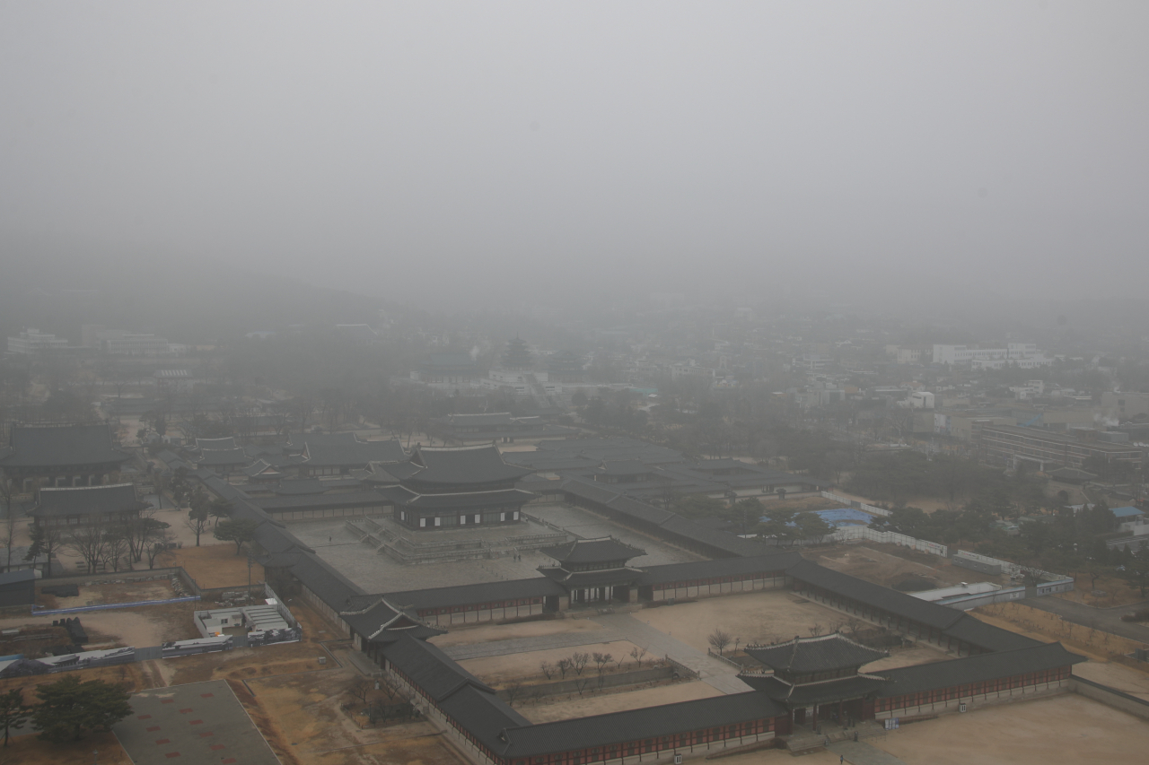 [사진=22일 오전 서울 종로구 경복궁에 안개가 짙게 껴 있다.] [연합] |