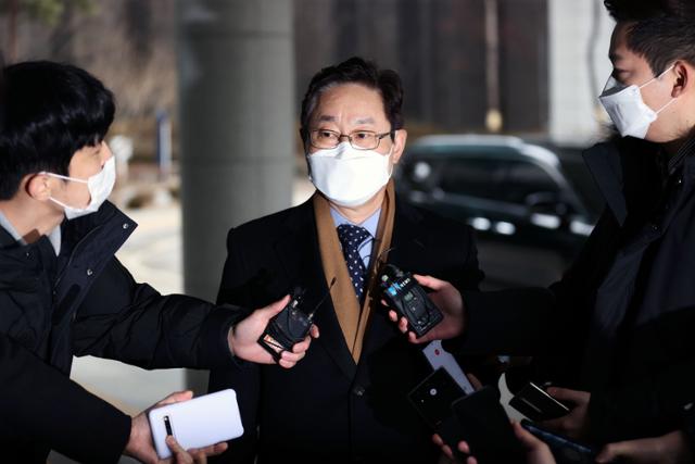 박범계 법무부 장관 후보자가 21일 서울고등검찰청에 마련된 인사청문회 준비 사무실로 출근하며 취재진 질문에 답하고 있다. 연합뉴스 |