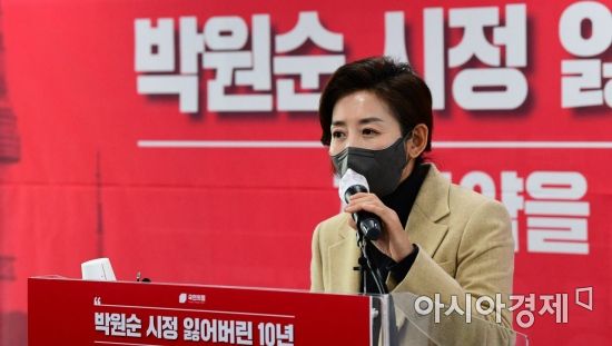 국민의힘 서울시장 경선 후보자인 나경원 전 의원이 20일 서울 여의도 국민의힝 당사에서 열린 '박원순 시정 잃어버린 10년, 재도약을 위한 약속' 발표회에 참석, 인사말을 하고 있다./윤동주 기자 doso7@ |