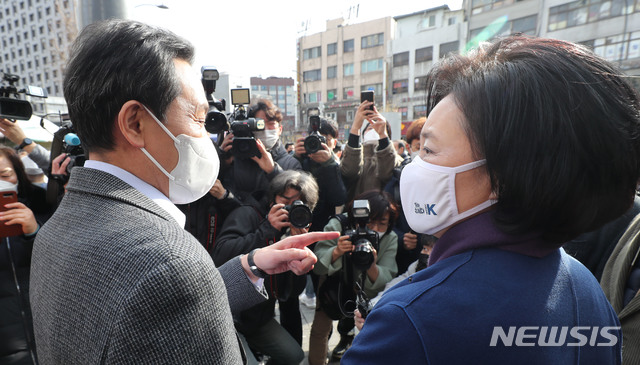 이달 23일 오전 서울 중구 남대문시장에서 서울시장 보궐선거 경선에 나서는 우상호 더불어민주당 의원과 박영선 전 중소벤처기업부 장관이 인사를 나누고 있다. / 사진제공=뉴시스 |