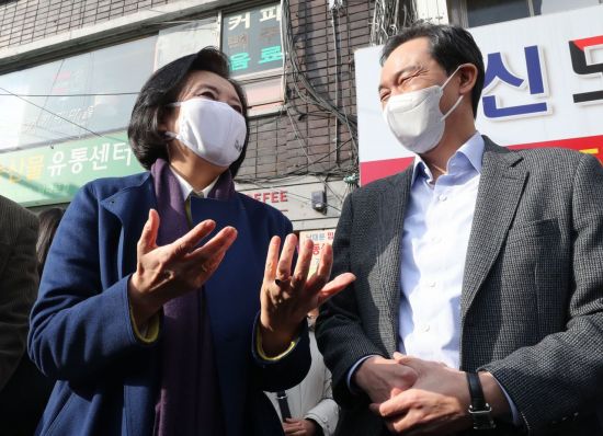 지난 23일 오전 서울 중구 남대문시장에서 서울시장 보궐선거 경선에 나서는 우상호 더불어민주당 의원(오른쪽)과 박영선 전 중소벤처기업부 장관이 대화를 하고 있다. [이미지출처=연합뉴스] |