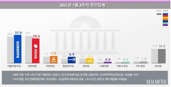 이어 국민의당이 7.6%, 열린민주당 6.9%, 정의당은 5.1%로 조사됐다. 무당층은 16.0%다.