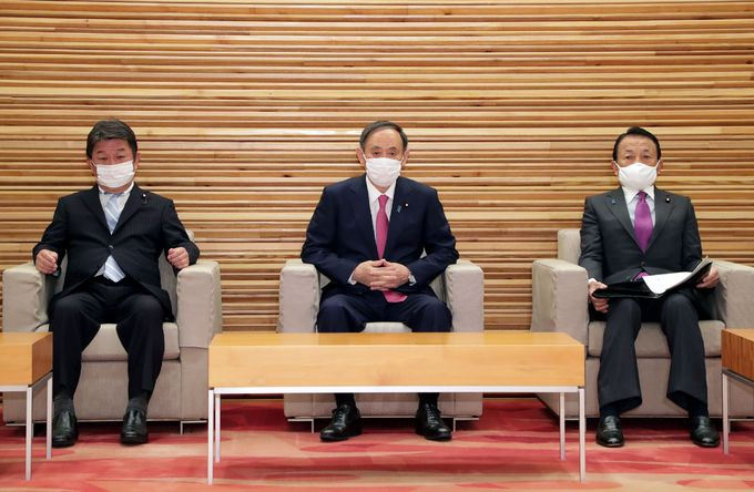 스가 요시히데 일본 총리(가운데) 정권이 코로나19 대응 실패로 아사히신문 여론조사에서 내각 지지율이 자민당 지지율에 밀리는 등 비상이 걸렸다. 사진은 지난 22일 총리 관저에서 열린 각의에 참석한 모테기 도시미쓰 외무상, 스가 총리, 아소 다로 부총리. 도쿄=AP지지연합뉴스 |