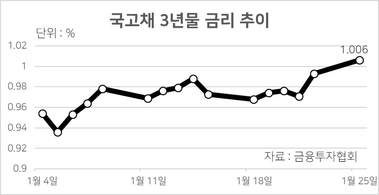 26일 금융투자협회에 따르면 3년 만기 국고채 금리(yield)는 전날 연 1.006%에 장을 마치며 지난해 4월 29일(1.006%) 이후 약 9개월 만에 가장 높은 수준을 기록했다.