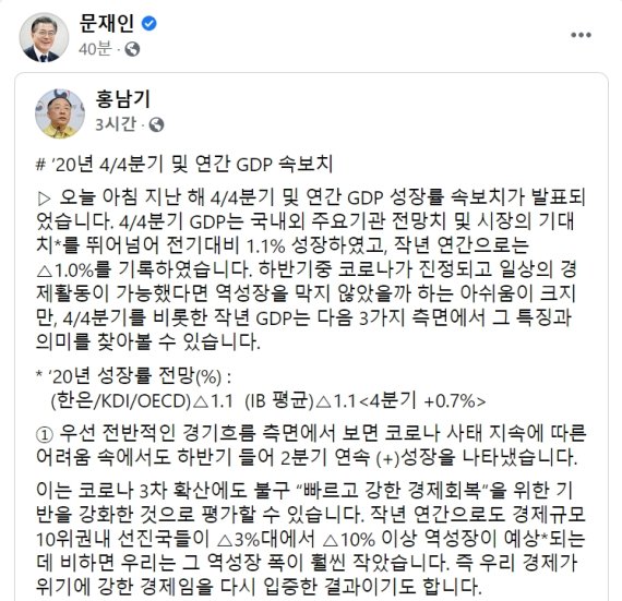 문 대통령은 이날 SNS에 홍남기 경제부총리 겸 기획재정부 장관이 페이스북에 게재한 '2020년 4·4분기 및 연간 GDP 속보치'라는 제목의 글을 올렸다.