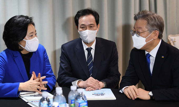 이재명 경기도지사가 26일 서울 여의도 글래드호텔에서 열린 경기도 기본주택 토론회에서 더불어민주당 서울시장 보궐선거 예비후보인 박영선 전 중소벤처기업부 장관, 우상호 의원과 대화하고 있다. 국회사진기자단 |