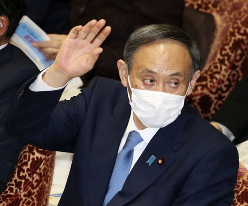 (도쿄 교도=연합뉴스) 스가 요시히데(菅義偉) 일본 총리가 25일 오후 일본 중의원 예산위원회에서 답변을 하기 위 손을 들고 있다. |