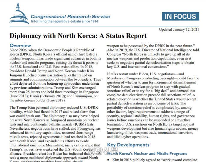 CRS은 “바이든 대통령은 (북한과의) 협상이 재개되면 실무회담을 강조하면서 북한에 더욱 전통적 외교 접근법을 추구할 것임을 시사했다”고 지적했다. 보고서는 이어 “바이든 정부에서 협상이 재개되면 미국 협상가들과 이를 감독할 의회 의원들은 북한 핵 프로그램의 점진적인 폐기에 발맞춰 단계적인 제재 완화를 목표로 할 것인지, 아니면 ‘빅딜’ 즉 완전한 비핵화가 완전한 제재 완화에 선행되어야 한다는 요구를 추구할을 시도할 것인지의 질문에 직면할 수 있다”고 분석했다. CRS는 “이것은 미국이 회담의 결과로서 (북한의) 부분적인 비핵화를 받아들일 것인지와도 관련된 질문”라고 덧붙였다.
