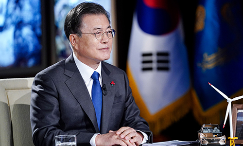 문재인 대통령이 27일 청와대에서 화상으로 열린 2021 세계경제포럼(WEF) 한국정상 특별연설에 참석해 경제일반에 대한 질문을 듣고 있다. 뉴시스 |