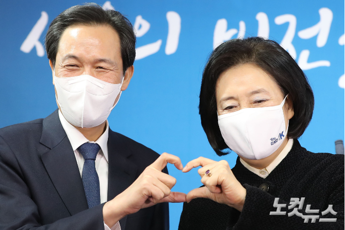 서울시장 보궐선거에 출마한 더불어민주당 우상호 의원, 박영선 전 장관. 윤창원 기자 |