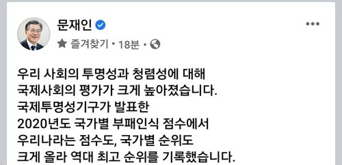 문 대통령은 이날 페이스북에 올린 글에서 "국제투명성기구가 발표한 2020년도 국가별 부패인식 점수에서 우리나라는 역대 최고 순위(33위)를 기록했다"며 이같이 밝혔다.