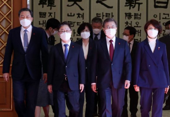 문 대통령은 3명의 신임 장관과 마스크를 착용한 채 기념사진을 촬영했으며, 촬영을 마친 후 참석자들과 인왕실에서 비공개 환담을 가졌다.