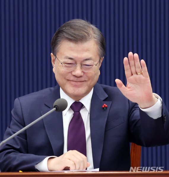 문재인 대통령이 28일 오후 청와대에서 샤브카트 미르지요예프 우즈베키스탄 대통령과 한-우즈베키스탄 화상 정상회담을 시작하며 손을 들어 인사하고 있다. /사진=뉴시스 |