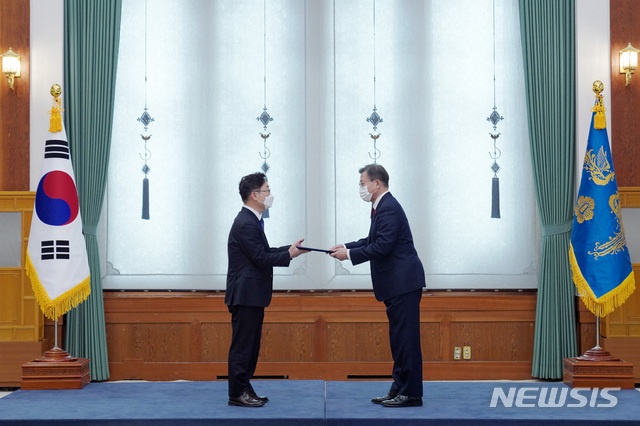 [서울=뉴시스]박영태 기자 = 문재인 대통령이 29일 오후 청와대에서 박범계 신임 법무부장관에게 임명장을 수여하고 있다. 2021.01.29. since1999@newsis.com |