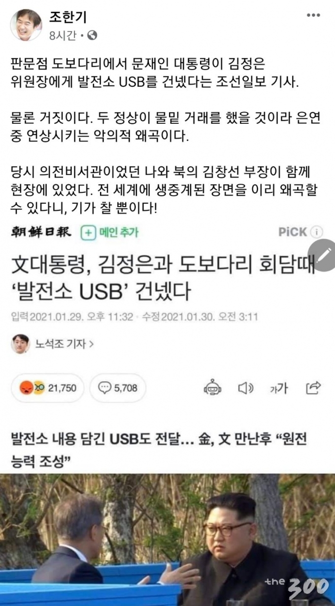 [the300]조한기 전 청와대 비서관이 31일 문재인 대통령이 판문점 도보다리 회담 때 김정은 북한 국무위원장에게 원자력 발전소 관련 자료가 담긴 USB를 건넸다는 일부 보도에 대해 "악의적 왜곡이다"고 비판했다.