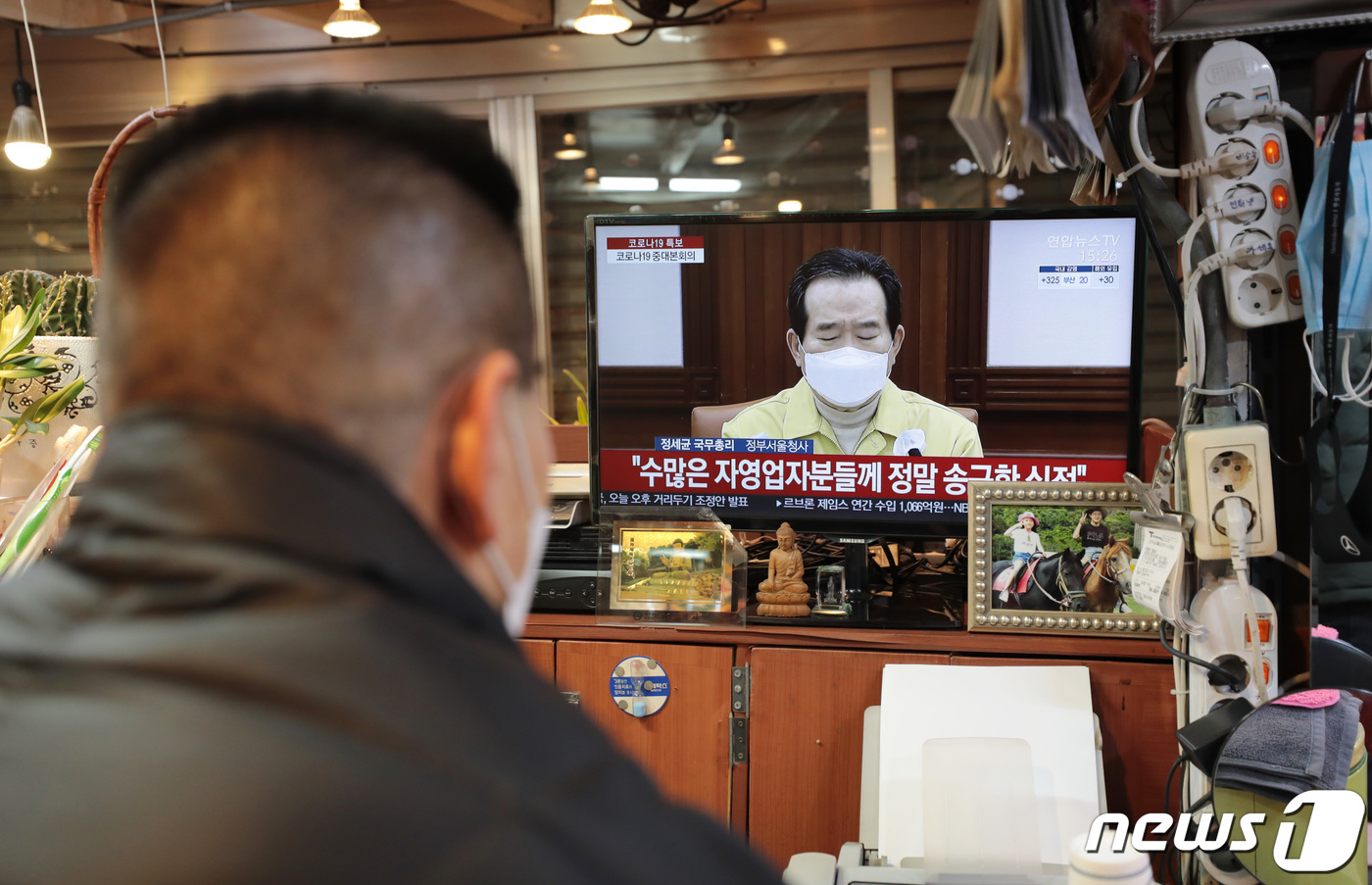 (서울=뉴스1) 이성철 기자 = 정부가 현행 사회적 거리두기 단계를 설 연휴가 끝날 때까지 2주 더 연장하겠다고 밝힌 31일 서울 광장시장에서 한 상인이 TV로 거리두기 연장 발표를 시청하고 있다. 이날 정세균 총리는 자영업자·소상공인들에게는 “송구하다”는 입장을 전하며 “조금만 더 힘내 달라”고 호소했다. 2021.1.31/뉴스1