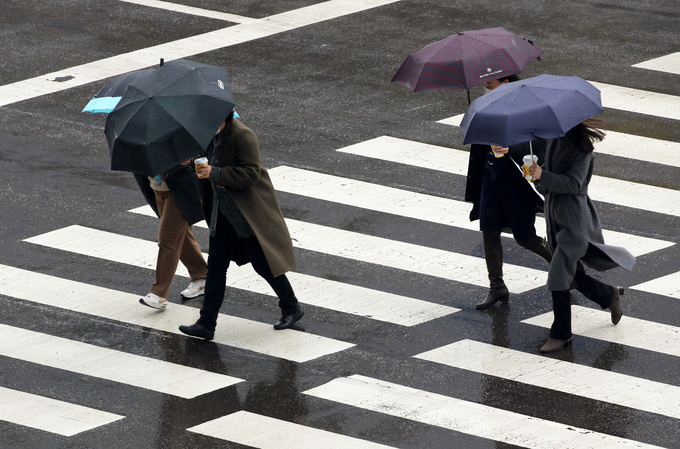 우산을 쓴 채 횡단보도를 건너는 시민들. 연합뉴스 |