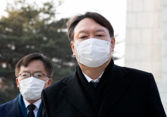 윤석열 검찰총장(오른쪽)이 지난달 4일 서울 동작구 국립서울현충원을 참배한 후 나서고 있다. /사진=박범준 기자 |