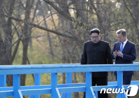 문재인 대통령과 김정은 국무위원장이 2018년 4월 27일 공동 식수를 마친 후 군사분계선 표식물이 있는 ‘도보다리’까지 산책을 하며 담소를 나누고 있다. /사진=뉴스1 |