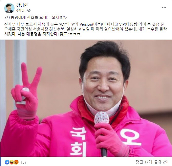 문재인 대통령비서실 사회수석비서관실 행정관을 지낸 여준성 보건복지부 장관 정책보좌관이 오세훈 전 서울시장의 ‘v’ 촌극 관련 지난 2일 페이스북에 남긴 글이다.