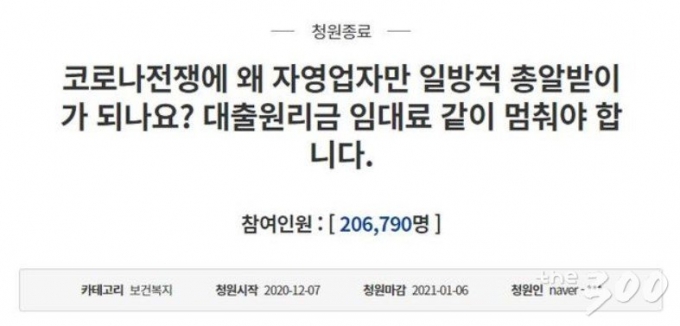 청원인은 코로나 방역 규제 방향이 90% 이상 자영업자만 희생시키고 있다며 코로나 집합금지가 되면 임대료, 공과금, 대출원리금 등이 함께 멈춰야 한다고 청원했다. 이 청원엔 20만6790명이 동의했다.