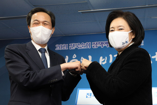 서울시장 보궐선거 출마 선언을 한 더불어민주당 우상호 의원과 박영선 전 중소벤처기업부 장관이 지난달 27일 서울 여의도 더불어민주당 서울시당에서 열린 ‘민주당 정책엑스포 in 서울’에서 기념촬영을 하고 있다 (사진=연합뉴스) |