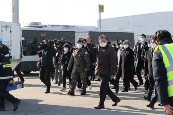 앞서 문 대통령은 공항에서 김경욱 인천국제공항공사 사장, 조원태 대한항공 회장의 영접을 받은 후 회의실에서 백신 수송과정을 담은 영상을 시청하고, 관련 부처의 백신 수송 관련 보고를 청취했다.