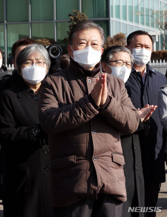 [인천공항=뉴시스]추상철 기자 = 문재인 대통령이 3일 오전 인천국제공항 대한항공 화물터미널에서 열린 코로나19 백신 수송 모의훈련에서 백신 수송트럭 출발 모습을 보며 박수치고 있다. 2021.02.03. scchoo@newsis.com <저작권자ⓒ 공감언론 뉴시스통신사. 무단전재-재배포 금지.> /사진=뉴시스화상 |