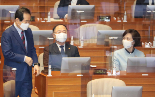 홍 부총리는 이에 대해 “혹시 정부와 의견이 다른 사안이 국민들께 확정된 것처럼 전달될 것 같아 글을 올렸다”며 “제가 드린 말씀은 많이 숙고하고 절제되게, 정중하게 표현하려고 했다”고 해명했다. 그는 전날 이 대표의 교섭단체 연설 직후 자신의 페이스북에 “추가적 재난지원금 지원이 불가피하다고 하더라도 전 국민 보편 지원과 선별 지원을 한꺼번에 모두 하겠다는 것은 정부로서는 받아들이기 어렵다”고 반대 입장을 표명한 바 있다.