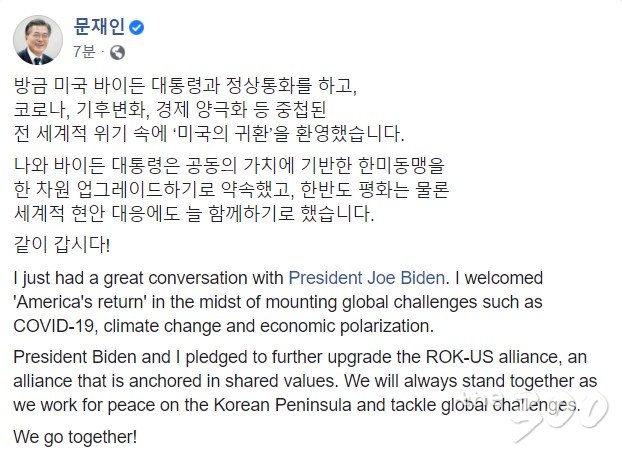 문 대통령은 이날 오전 자신의 페이스북 등 SNS에 "나와 바이든 대통령은 공동의 가치에 기반한 한미동맹을 한 차원 업그레이드하기로 약속했고, 한반도 평화는 물론 세계적 현안 대응에도 늘 함께하기로 했다"며 이같이 적었다.