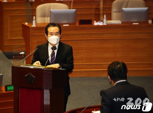 정세균 국무총리가 4일 서울 여의도 국회 본회의장에서 열린 정치·외교·통일·안보 분야 대정부 질문에서 권성동 국민의힘 의원의 질의에 답변하고 있다. /사진=뉴스1 |