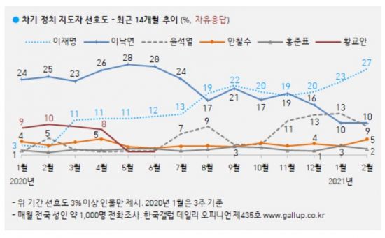 한국갤럽은 지난 2~4일 전국 만 18세 이상 1002명에게 한국을 이끌어갈 정치 지도자, 즉 다음 대통령감으로 누가 좋다고 생각하는지 물은 결과 이 지사라고 대답한 응답자가 27%로 가장 많았다고 5일 밝혔다.