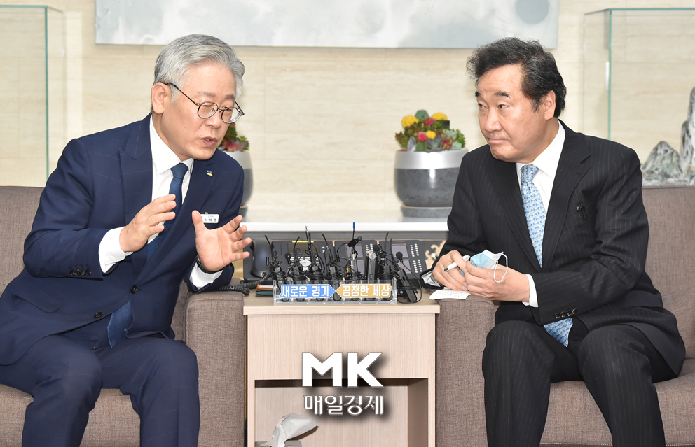 여권 잠룡으로 양강 구도를 형성하고 있는 더불어민주당 이낙연 의원과 이재명 경기도지사가 지난해 7월 30일 오전 경기 수원시 경기도청에서 만나 대화를 나누고 있다. 2020.7.30.이승환기자 |