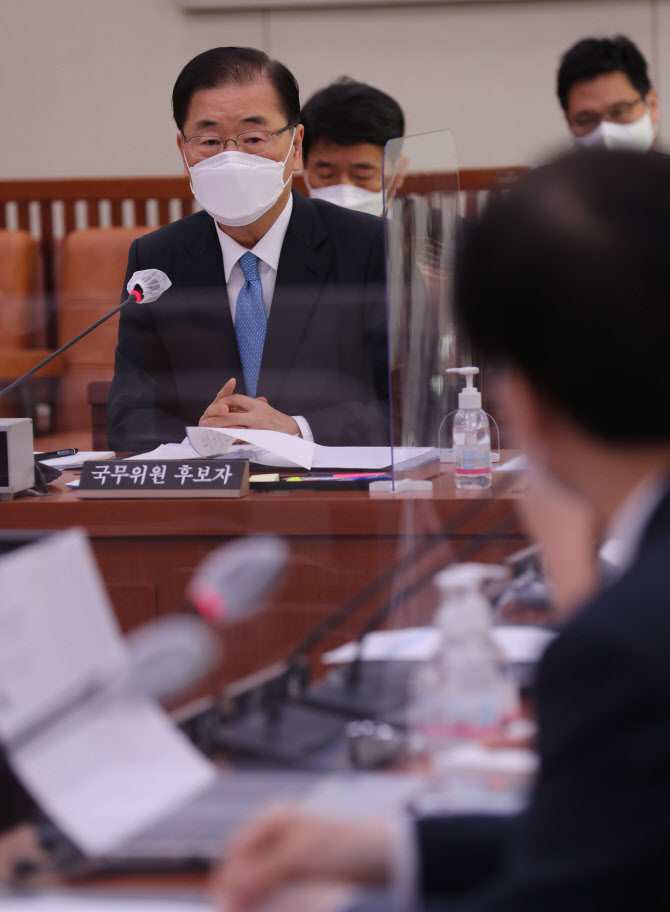 정의용 외교부 장관 후보자가 5일 국회 외교통일위원회에서 열린 인사청문회에서 질의에 답변하고 있다. (사진=연합 뉴스제공) |