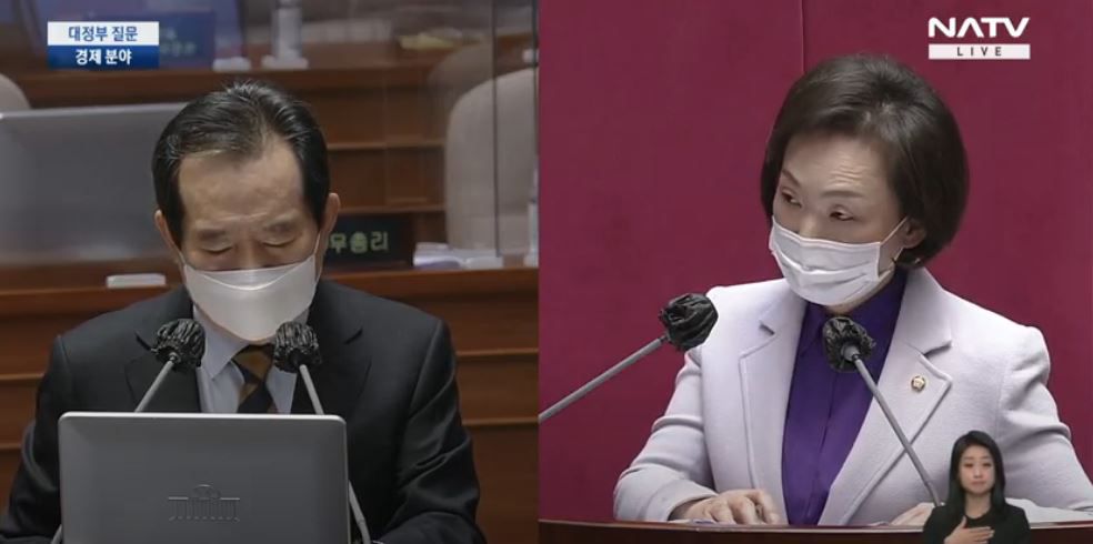 5일 국회 대정부질문에서 질문하는 한무경(오른쪽) 국민의힘 의원과 답하는 정세균 국무총리. /국회방송 |