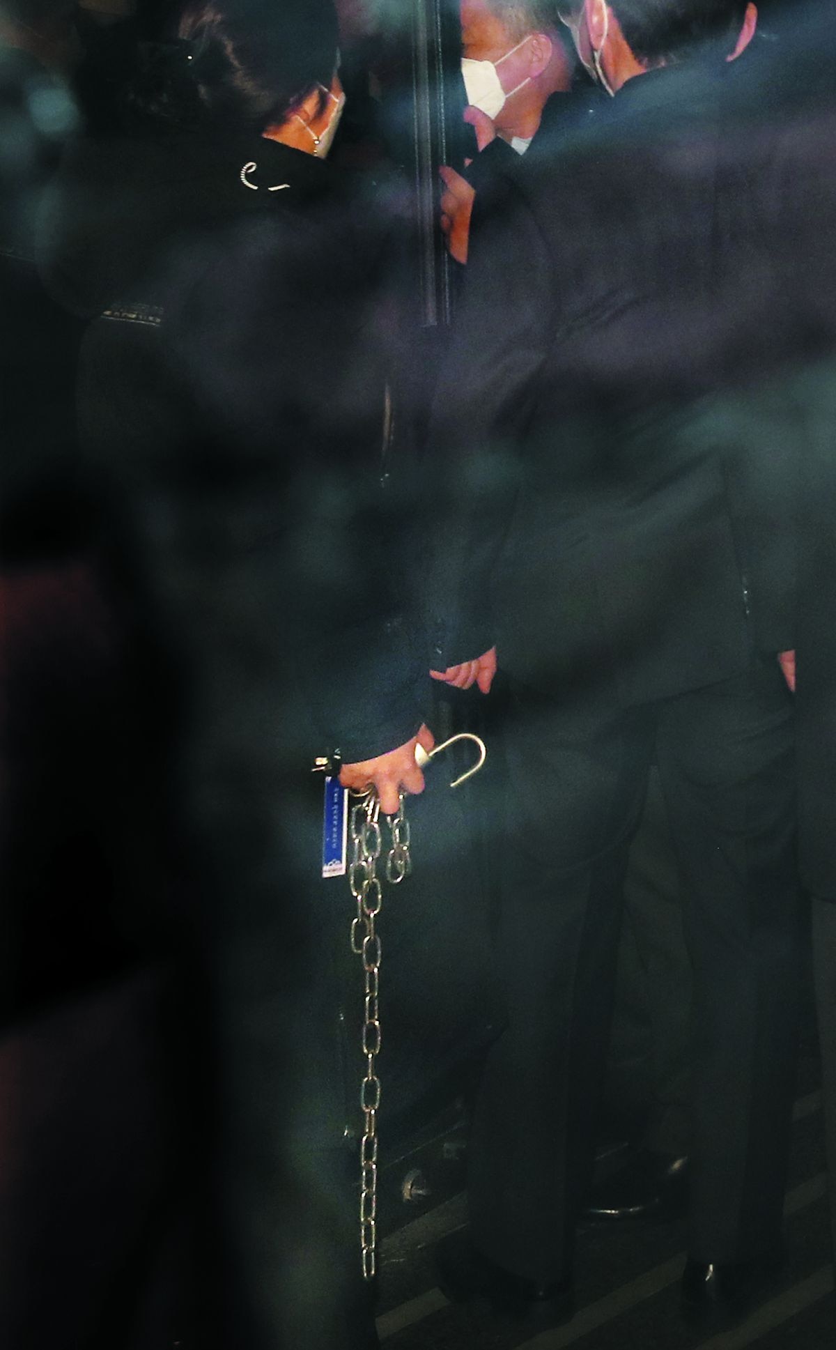 국민의힘 의원들이 5일 법관 탄핵과 관련해 서울 서초구 대법원 청사를 항의 방문하자 대법원 보안 직원들이 쇠사슬로 중앙 출입구를 봉쇄하려 하고 있다. 대법원은 국민의힘 의원들이 대법원 청사로 들어가려 하자 한때 이 쇠사슬로 출입문을 봉쇄하기도 했다./ 장련성 기자 |
