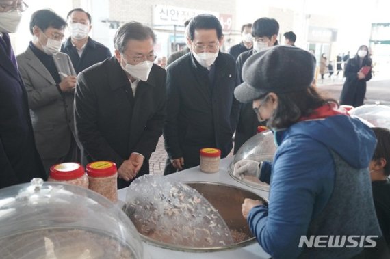 [파이낸셜뉴스] 문재인 대통령은 5일 코로나19 사태로 어려움을 겪는 지역 상인들을 직접 만나 위로하고 격려했다.
