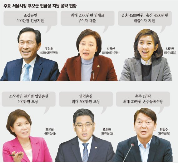 여당에서 우상호 더불어민주당 의원이 서울시 소상공인·자영업자를 위한 100만원 긴급지원금 지원을 꺼내들고, 박영선 전 중소벤처기업부 장관은 최대 2000만원 임대료 무이자 대출을 제시했다.