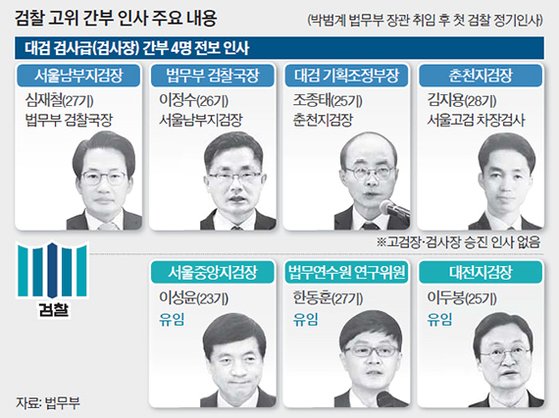 신임 법무부 검찰국장에 임명되면서 이번 인사의 핵심으로 떠오른 이정수 서울남부지검장을 보는 시선도 곱지만은 않다. 이 지검장은 박 장관이 중퇴했던 서울 남강고 출신이다. 박 장관이 6회, 이 지검장이 13회다. 박 장관이 고교 후배만 챙겼다는 비판이 나오는 이유다.