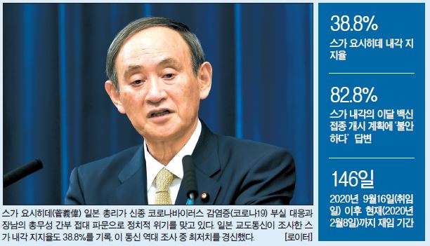 스가 요시히데(菅義偉) 일본 총리가 각종 악재로 취임 5개월도 안 돼 최악의 지지율을 연일 경신하면서 추락을 거듭하고 있다. 신종 코로나바이러스 감염증(코로나19) 부실 대응, 여권 정치인의 유흥업소 방문 파문에 이어 스가 총리의 장남이 유력 고위 관료를 접대한 사실마저 폭로되면서 정권의 기반 자체가 흔들리는 모습이다. |