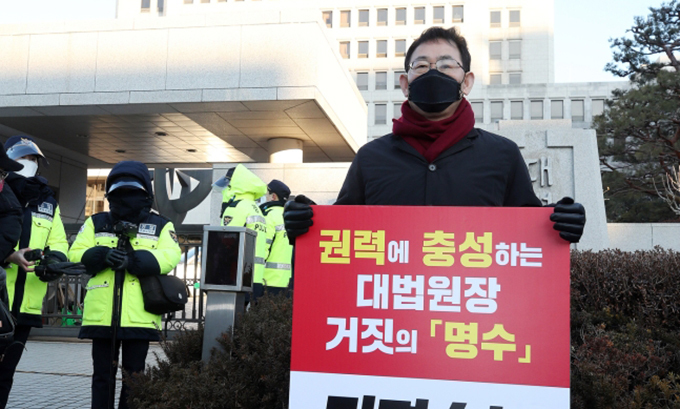 주호영 국민의힘 원내대표가 8일 오전 서울 서초구 대법원 앞에서 김명수 대법원장의 사퇴를 촉구하는 피켓 시위를 하고 있다. 뉴스1 |